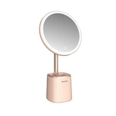 高 CRI 和耀眼的光源品質。一鍵調光。含儲物底座的二合一設計。專業級化妝燈光效果。